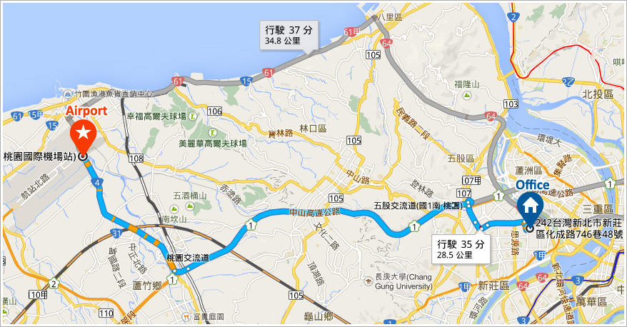 Driving time from Xinzhuang District to Taoyuan International Airport : 35 minutes.
